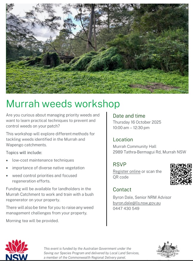 Join South East Local Land Services for this workshop that will explore different control methods for tackling weeds identified in the Murrah and Wapengo catchments. Register Here – https://events.humanitix.com/murrah-weeds-workshop-oct-2025